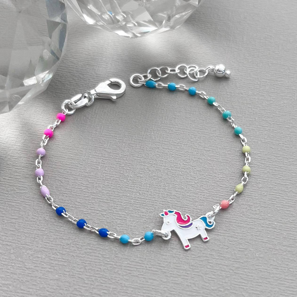 Design Vibrante e Encantador: Com uma sequência de bolinhas coloridas e um pingente de unicórnio em prata, esta pulseira foi projetada para capturar a imaginação das crianças, adicionando um toque mágico ao seu vestuário diário.
